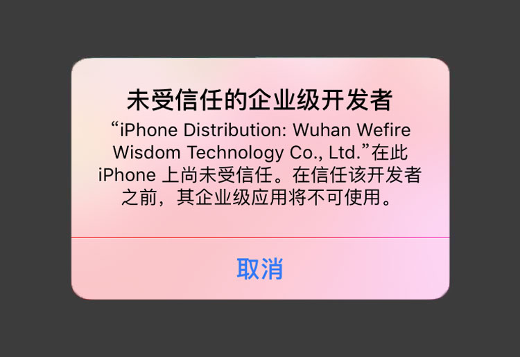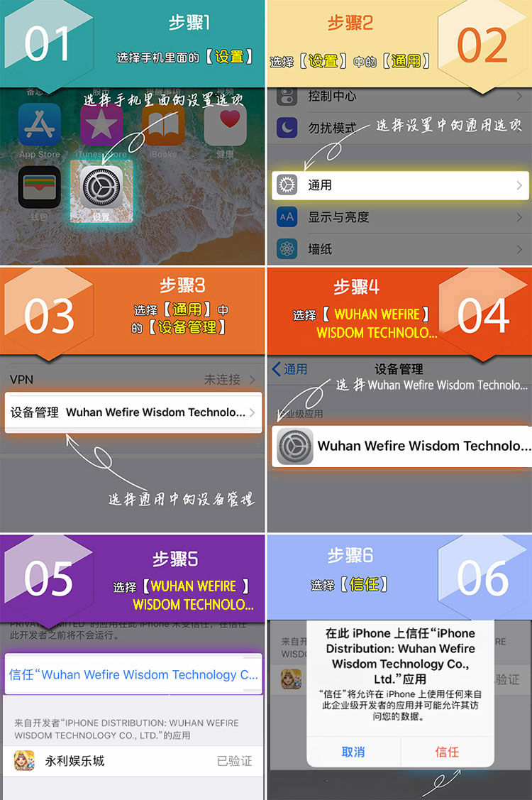 2、在手机找到「设置」-「通用」-「设备管理」-「Wuhan Wefire Wisdom Technolo...」-「信任」,点击「博乐棋牌」,会出现下图所示的提示。